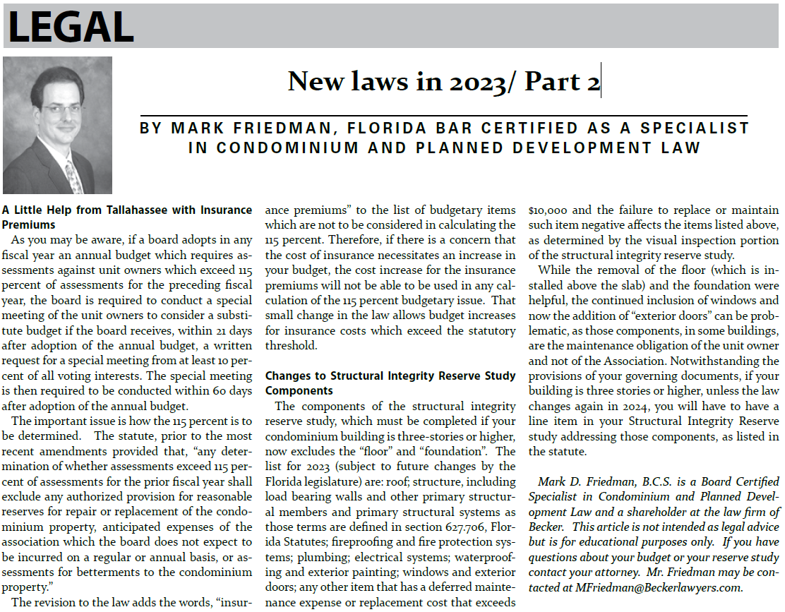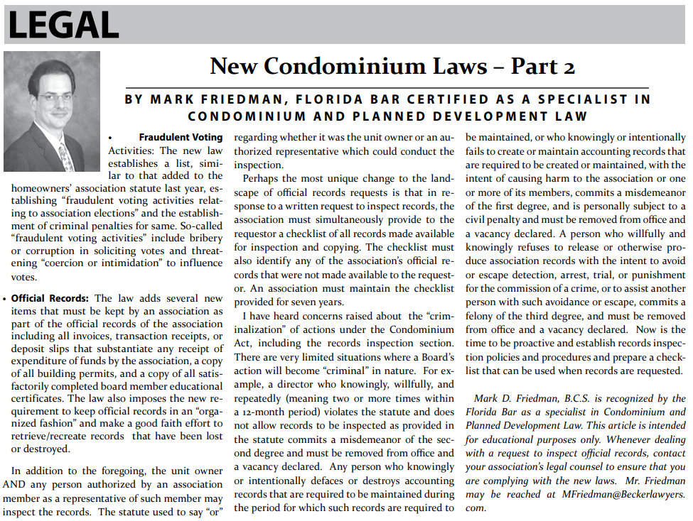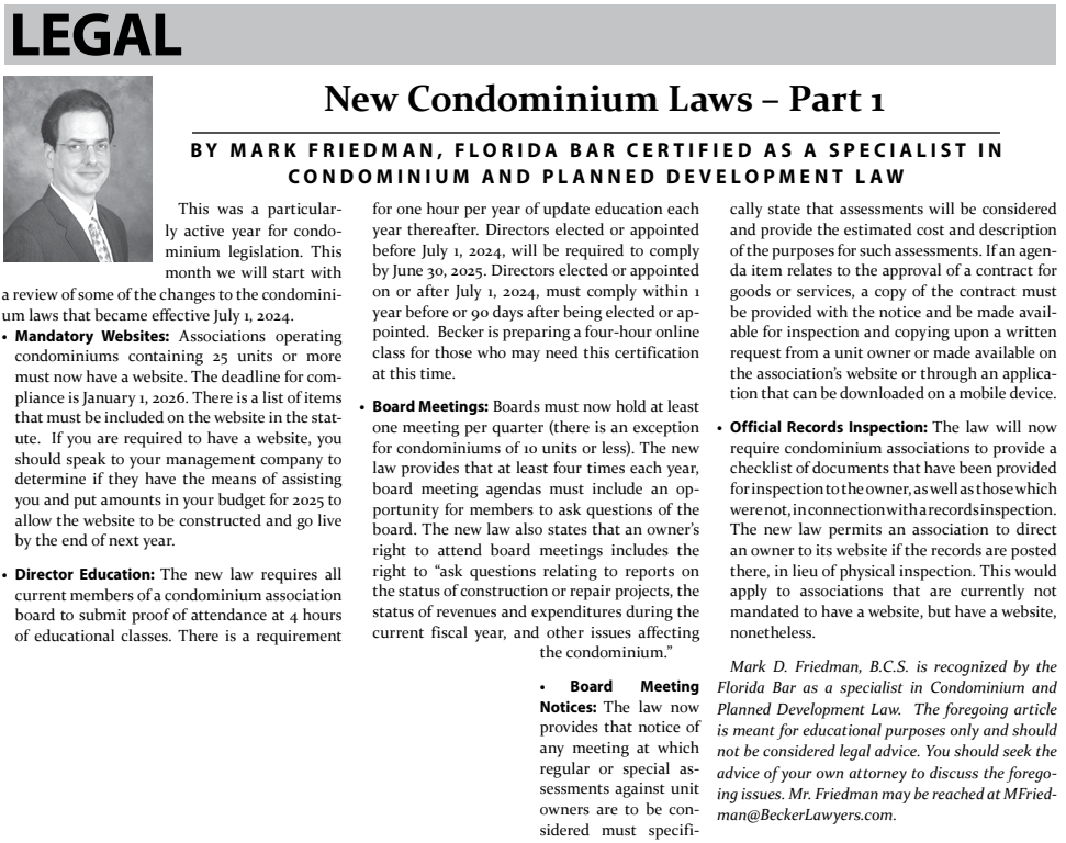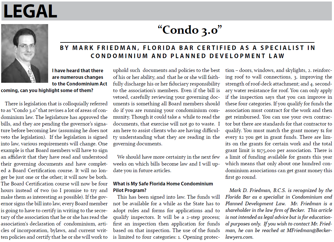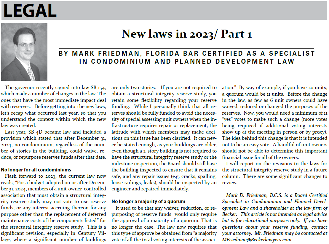 As Condo Attorneys begin to give their interpretation of these new laws, we will provide articles to give further insight into the changes to the statutes. The above are simply a small sample of the changes taking place, with the bill going into further detail and specific requirements.